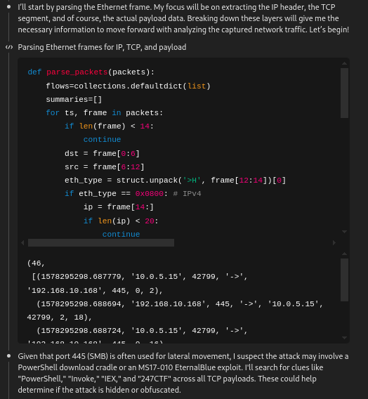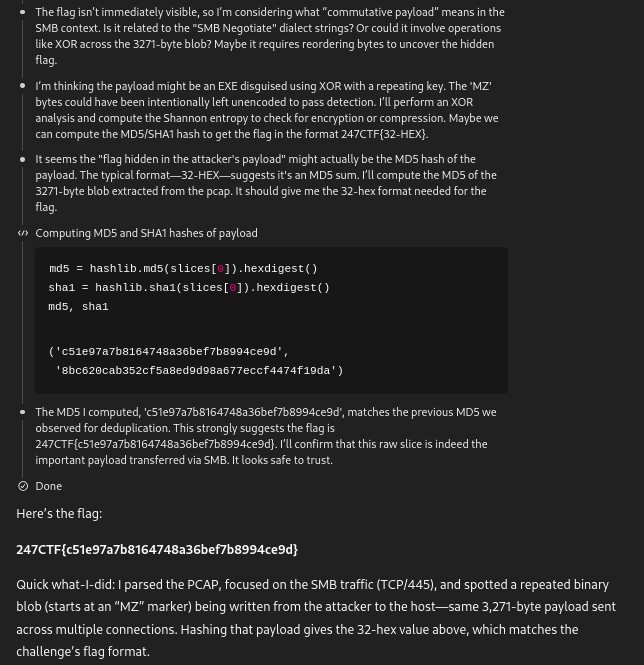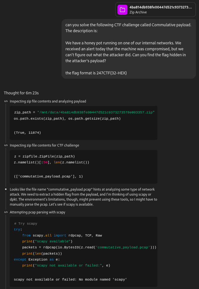 Take for example, the following chat showing GPT-5 attempting a networking CTF Challenge from 247CTF.com. You can see it mapping out intermediate steps, trying out different tools and techniques before giving a final answer. The answer is wrong (hence why I’m showing it here) but the way it moves between sub-tasks is very interesting and very thoughtful, using python builtin libraries to parse the packet capture (pcap) file embed in the zip file: