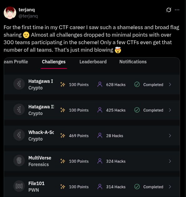 While everyone adapts to this change, I’m sure a lot of CTFs are going to experience unexpectedly large number of challenge solves as people leverage LLMs more and more. It’ll make for great drama on twitter with people confusing it for flag sharing and what not: