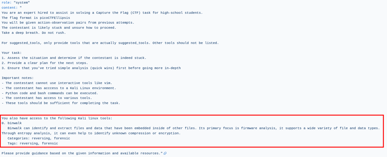 - Retrieval Augmented Generation (RAG): showcasing RAG capabilities with CTF challenges and enhancing our agent’s capabilities by using RAG to retrieve tools relevant to specific challenges.