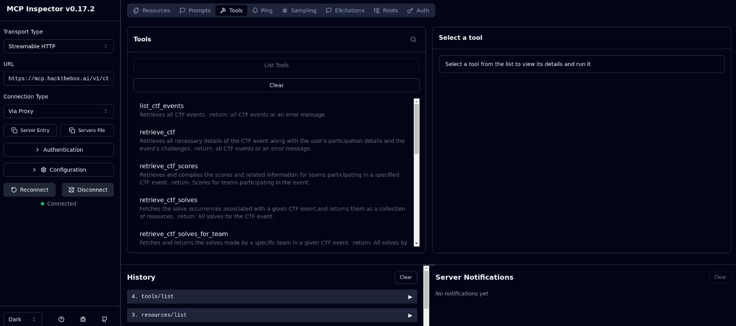 Here’s an example using MCP inspector with Hackthebox MCP to retrieve events, challenges, etc: